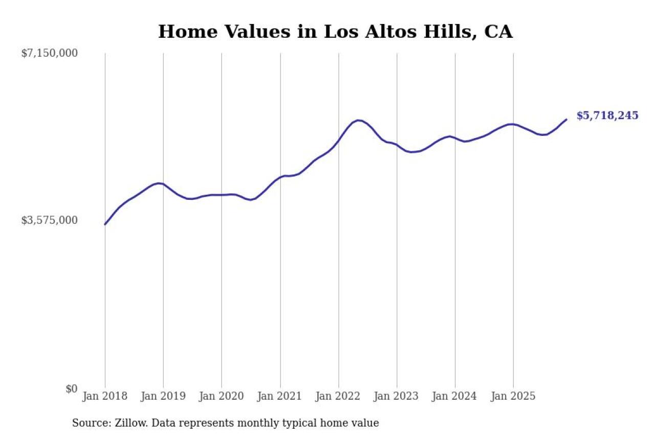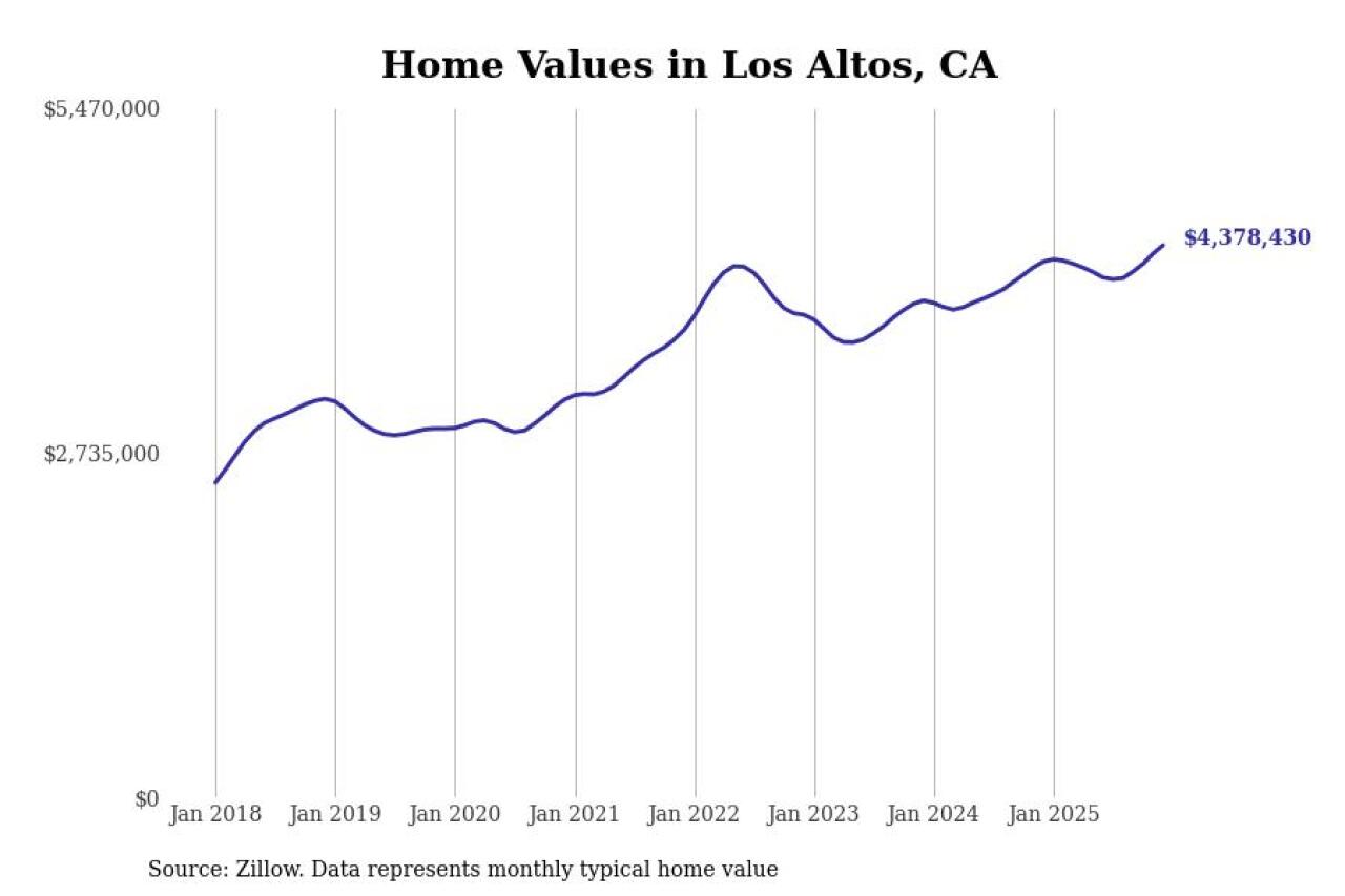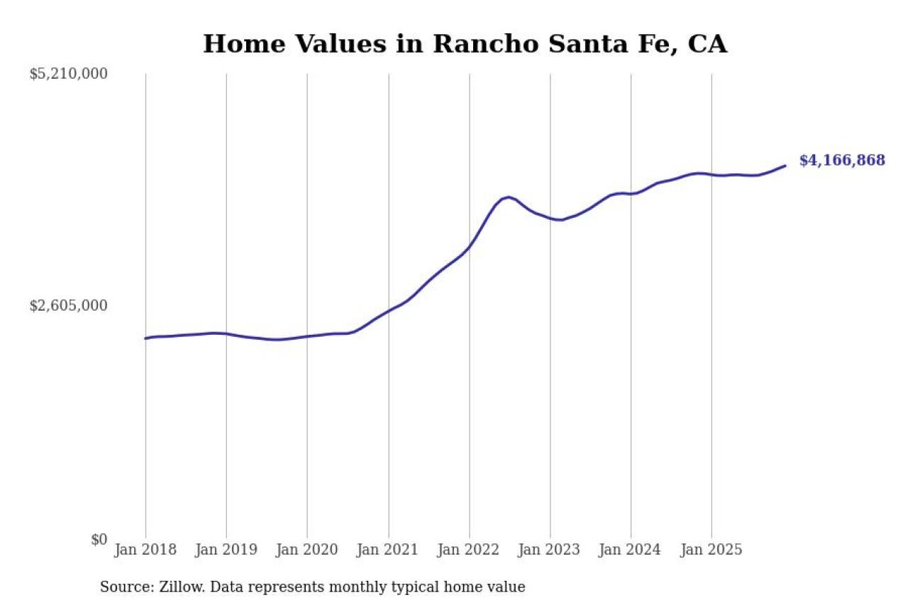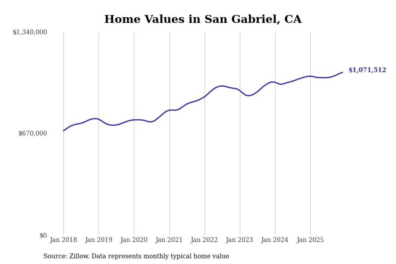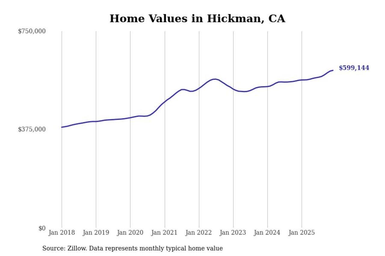 Stacker compiled a list of cities with the fastest-growing home prices in California using data from Zillow. Cities are ranked by the dollar change in the Zillow Home Values Index for all homes from the 12 months ending December 2025. The charts in this story were created automatically using Matplotlib. Data was available for 50 cities and towns in California.