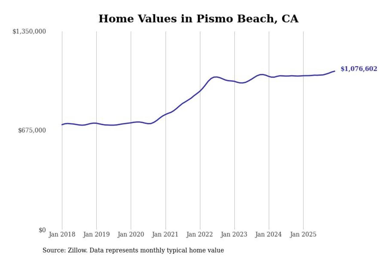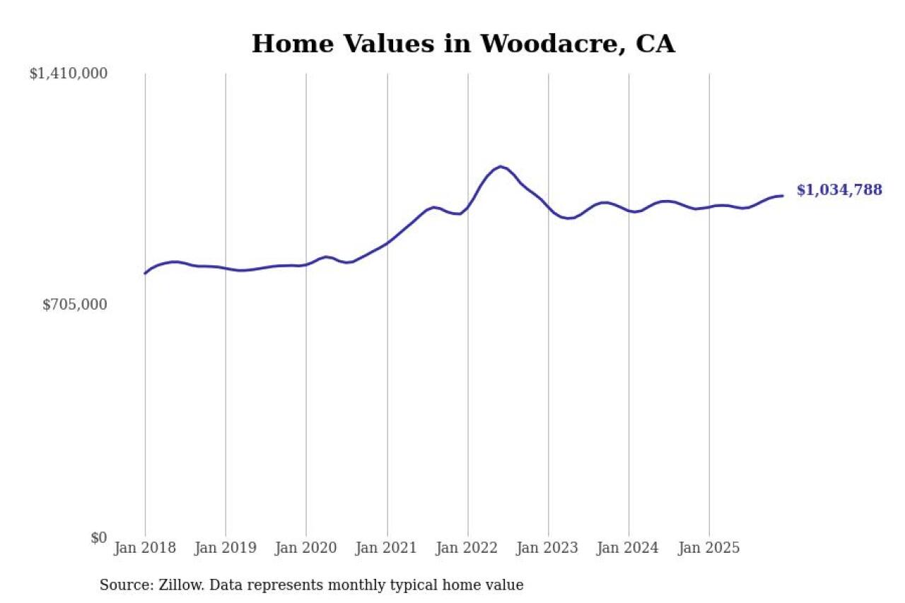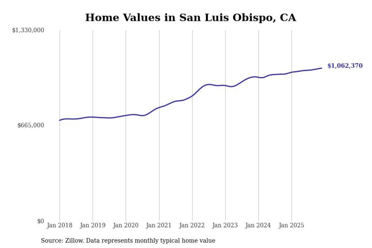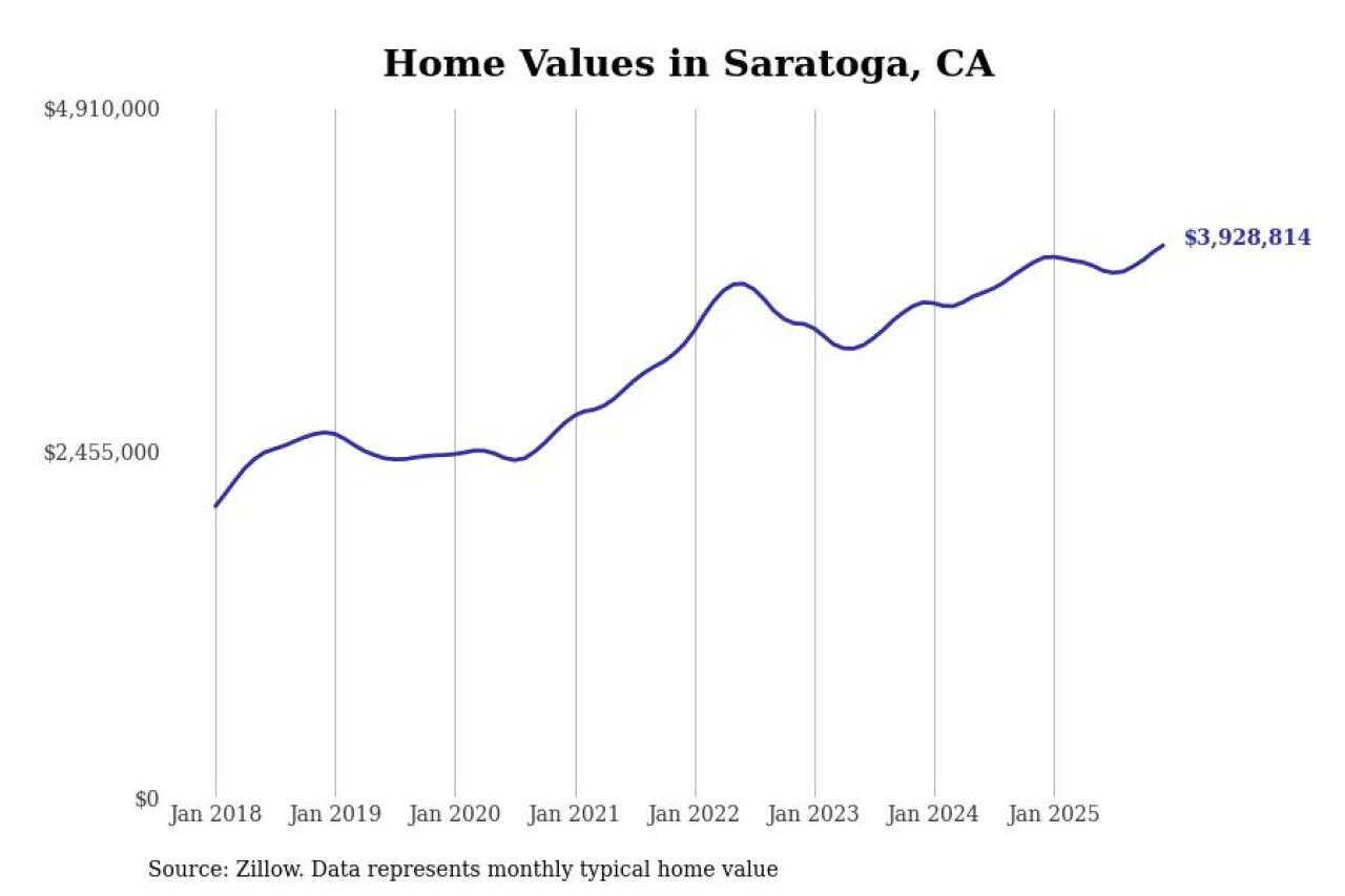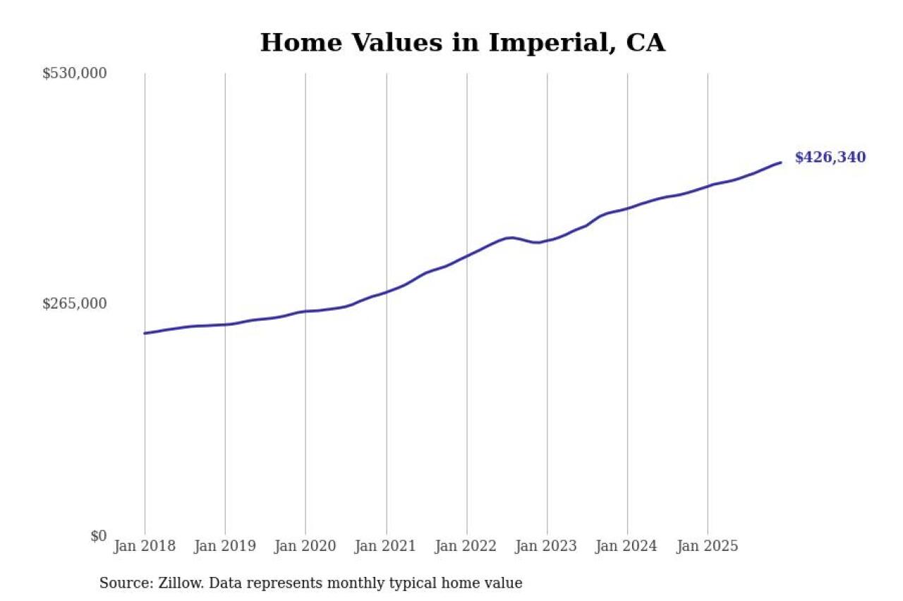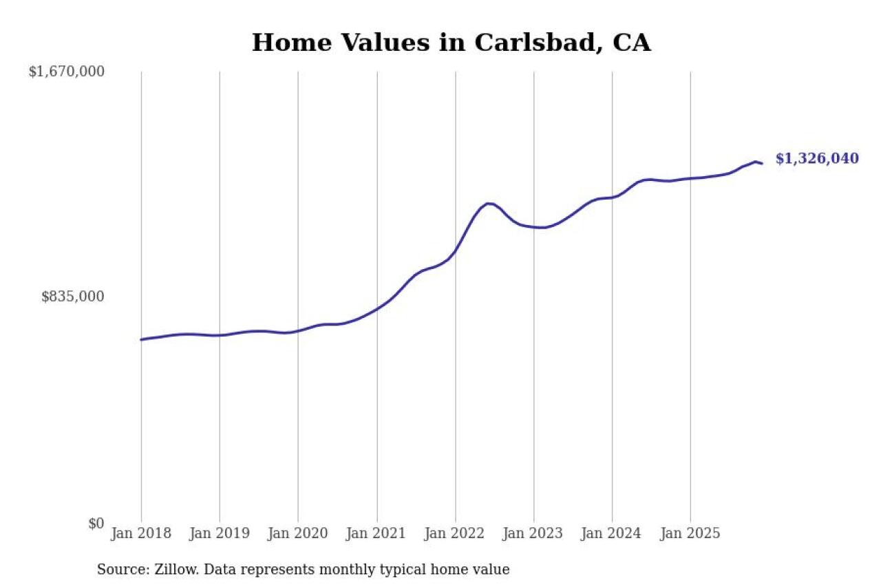 Stacker compiled a list of cities with the fastest-growing home prices in California using data from Zillow. Cities are ranked by the dollar change in the Zillow Home Values Index for all homes from the 12 months ending December 2025. The charts in this story were created automatically using Matplotlib. Data was available for 50 cities and towns in California.