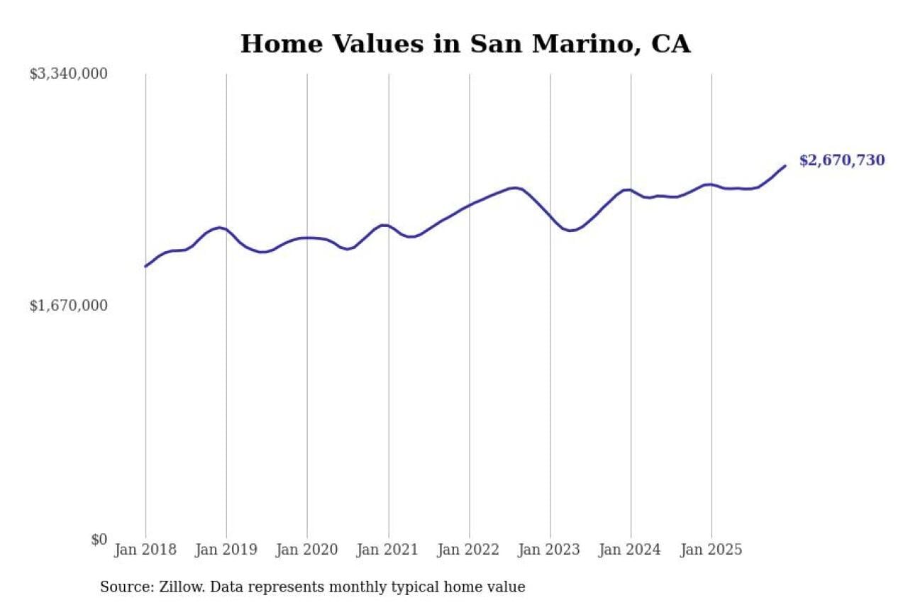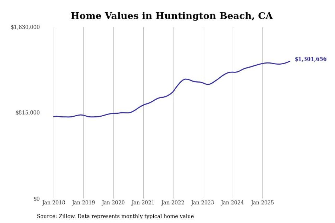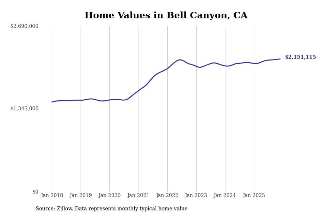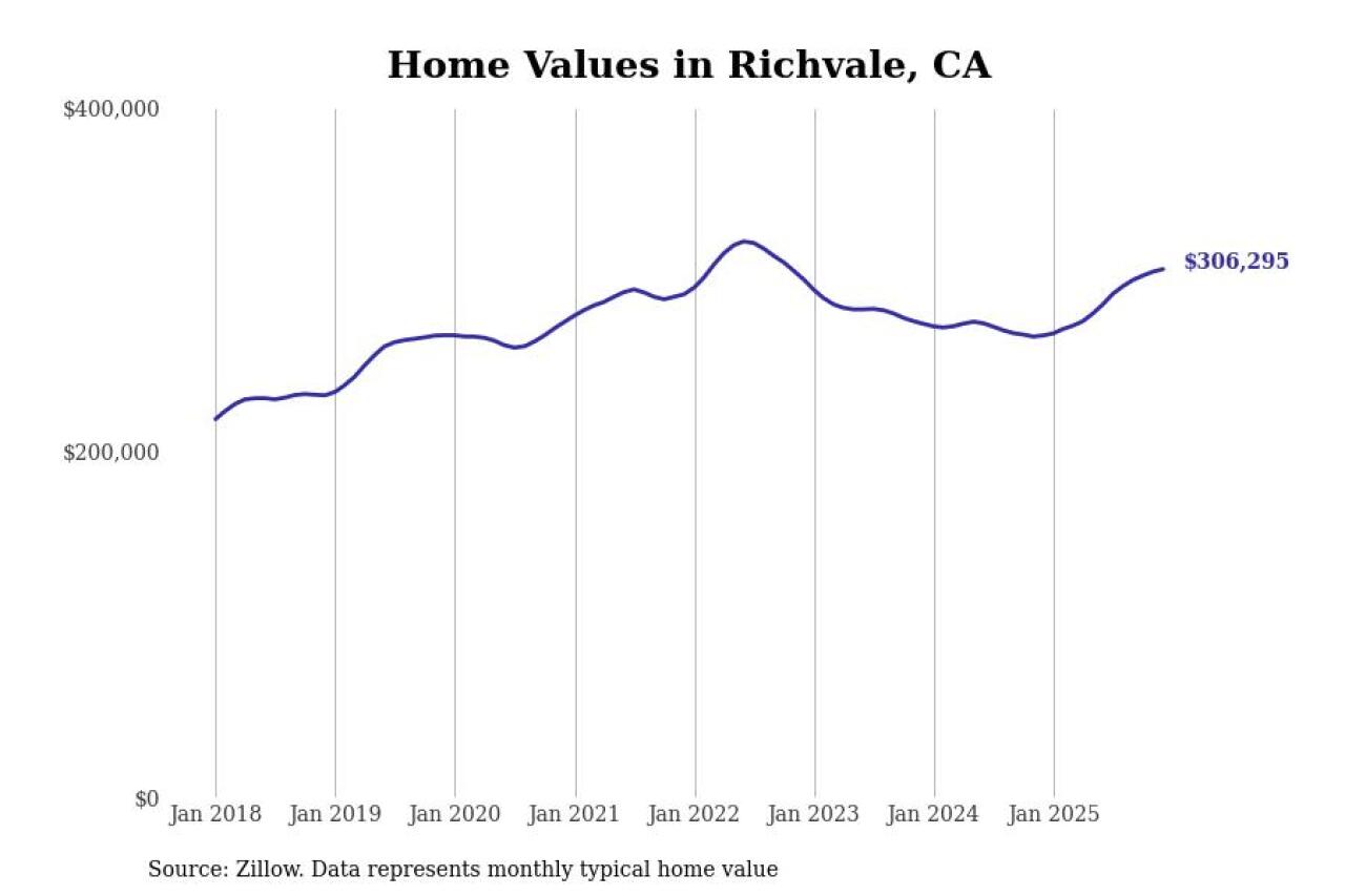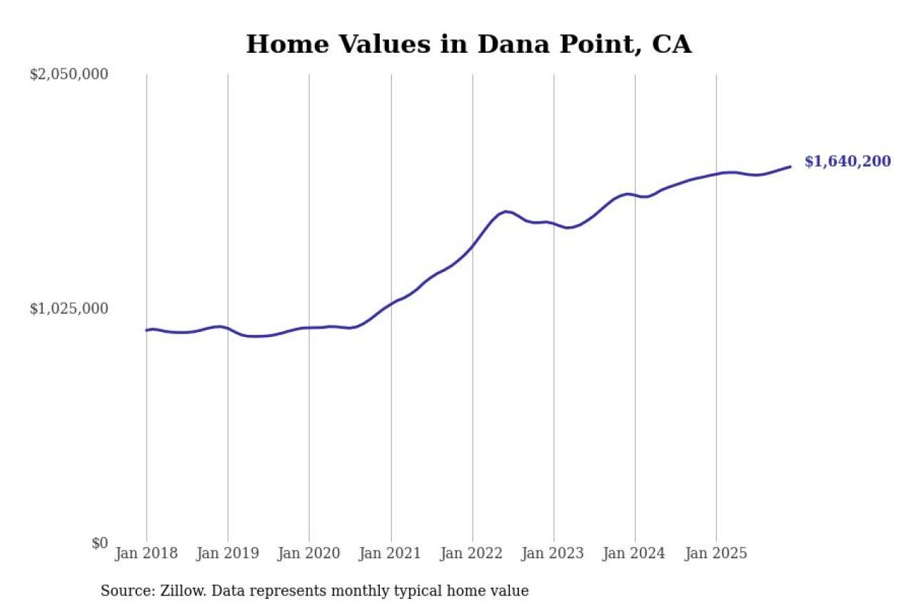 Stacker compiled a list of cities with the fastest-growing home prices in California using data from Zillow. Cities are ranked by the dollar change in the Zillow Home Values Index for all homes from the 12 months ending December 2025. The charts in this story were created automatically using Matplotlib. Data was available for 50 cities and towns in California.