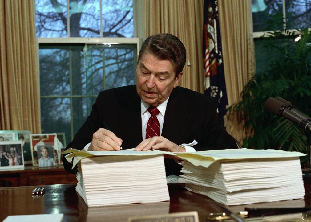 President Ronald Reagan started off decades of cuts to the tax rates paid by the country’s top earners, a trend that economists point to as one cause of the enormous wealth gap in today’s United States. The first round of Reagan tax cuts, enacted by both Republicans and Democrats, came in 1981, when the top rate dropped to 50% from 70%. The second round brought that top rate down to 28% by 1988. The country’s top 1% won a bonanza of $350,000 in tax cuts in 1985 compared to $3,500 for a typical household and a few hundred dollars for the poor, according to John Komlos, an economics historian.