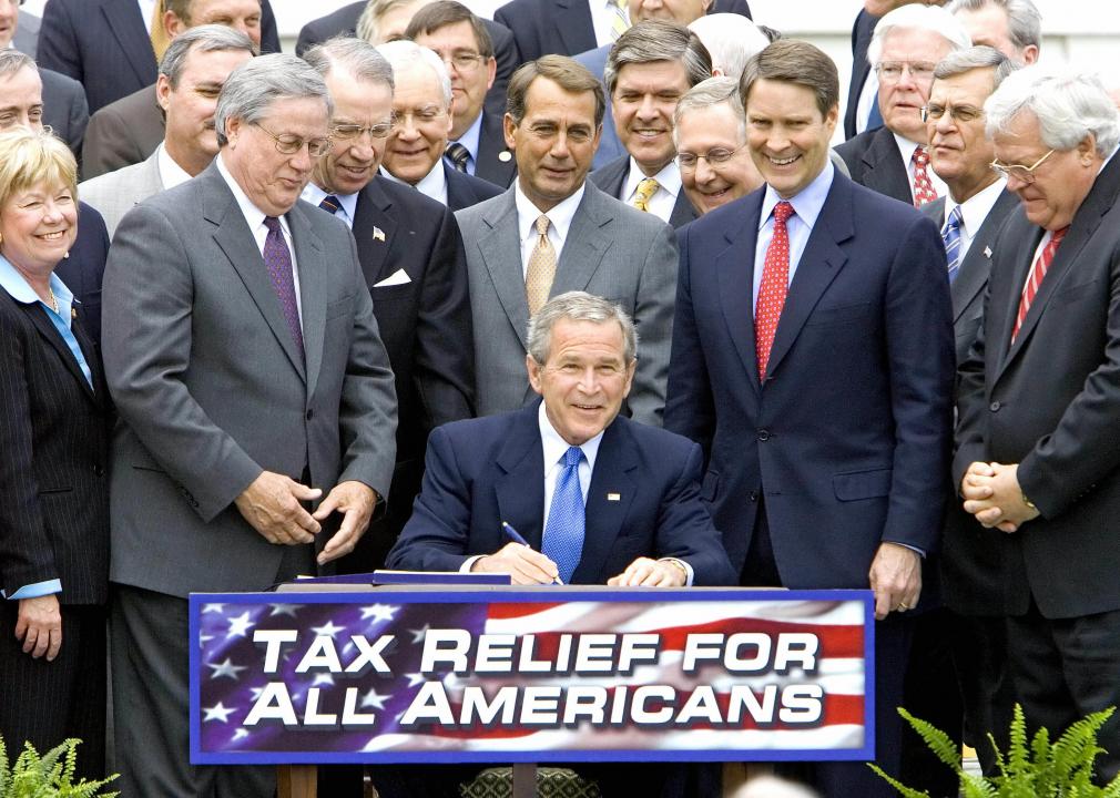 The tax rate cuts under President George W. Bush mostly benefited high-income taxpayers, according to the Center of Budget and Policy Priorities. The top 1% got a tax cut of on average more than $570,000 in the years between 2004 and 2012, increasing their after-tax income by more than 5% each year as a result. Besides cutting rates, the acts also phased out the estate tax and included provisions for the middle class. The cost of the tax laws? About 2% of the GDP in 2010, the year they were fully integrated.