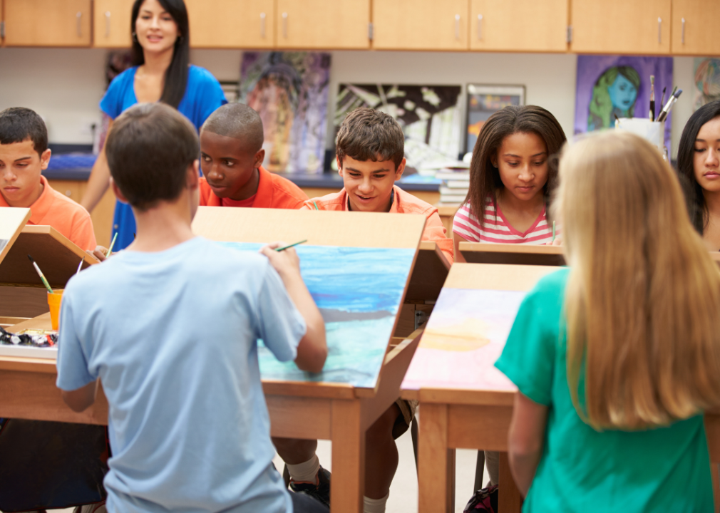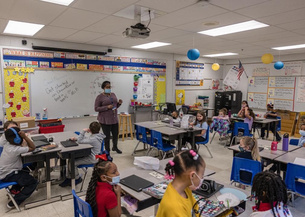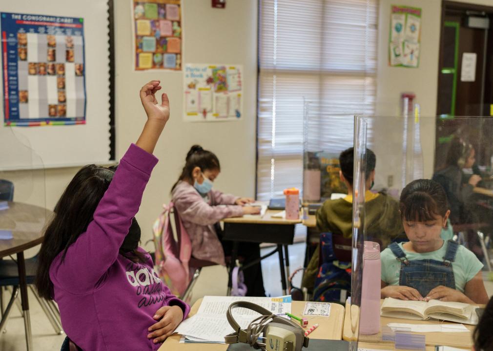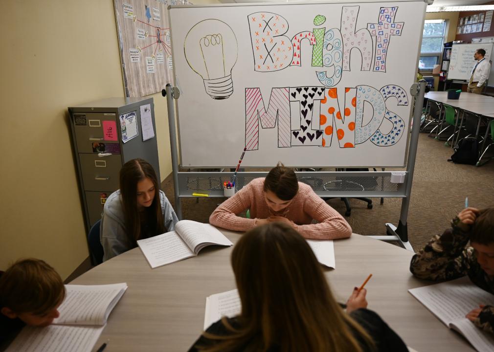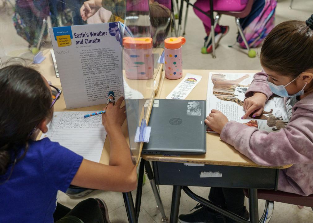 Two third grade girls work on assignments in class, one with an animal book and the other with a weather book.