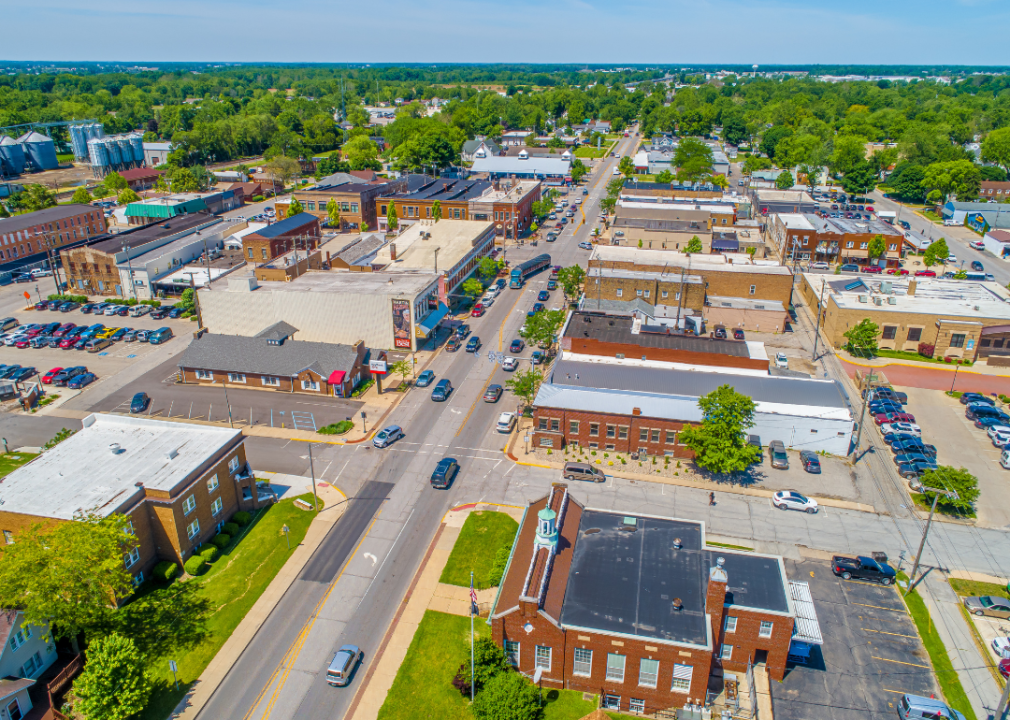 Aerial panoramic view of Atlanta, Georgia homes, highways and buildings.