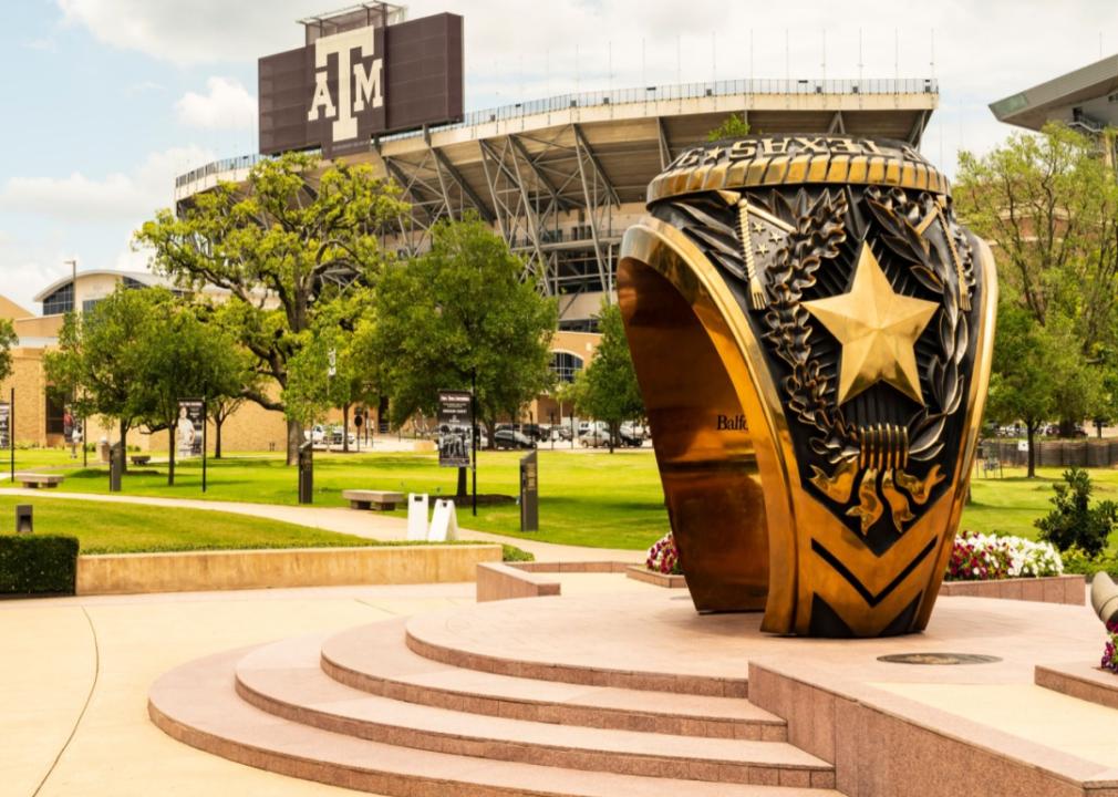 A giant statue of a class ring outside the Texas A&M University stadium.