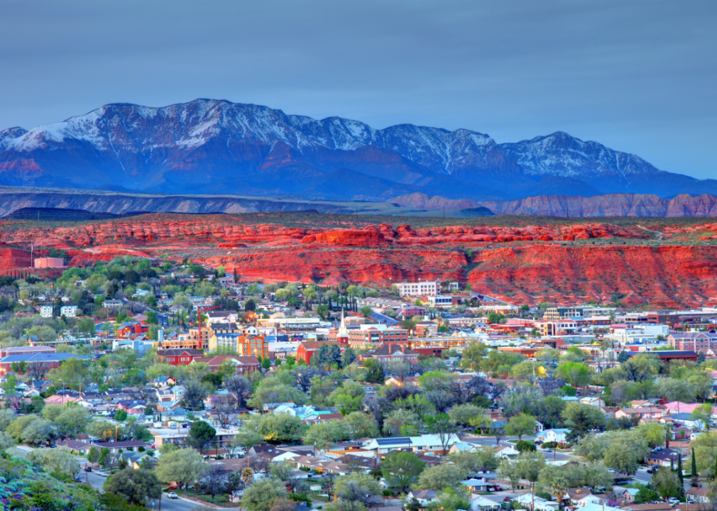Aerial view of homes and buildings in St. George, Utah with orange mesa and snow-capped mountains in the background.