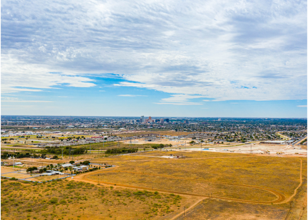 Aerial shot of flat landscape in Midland, Texas with buildings and homes in the distance.