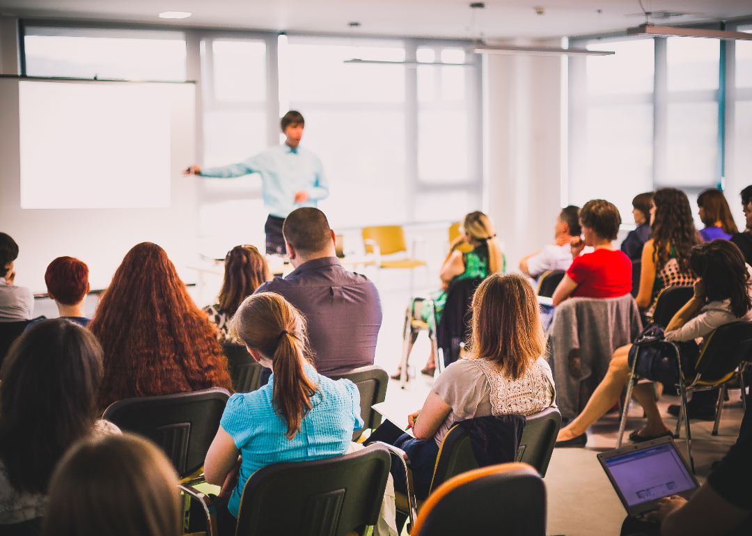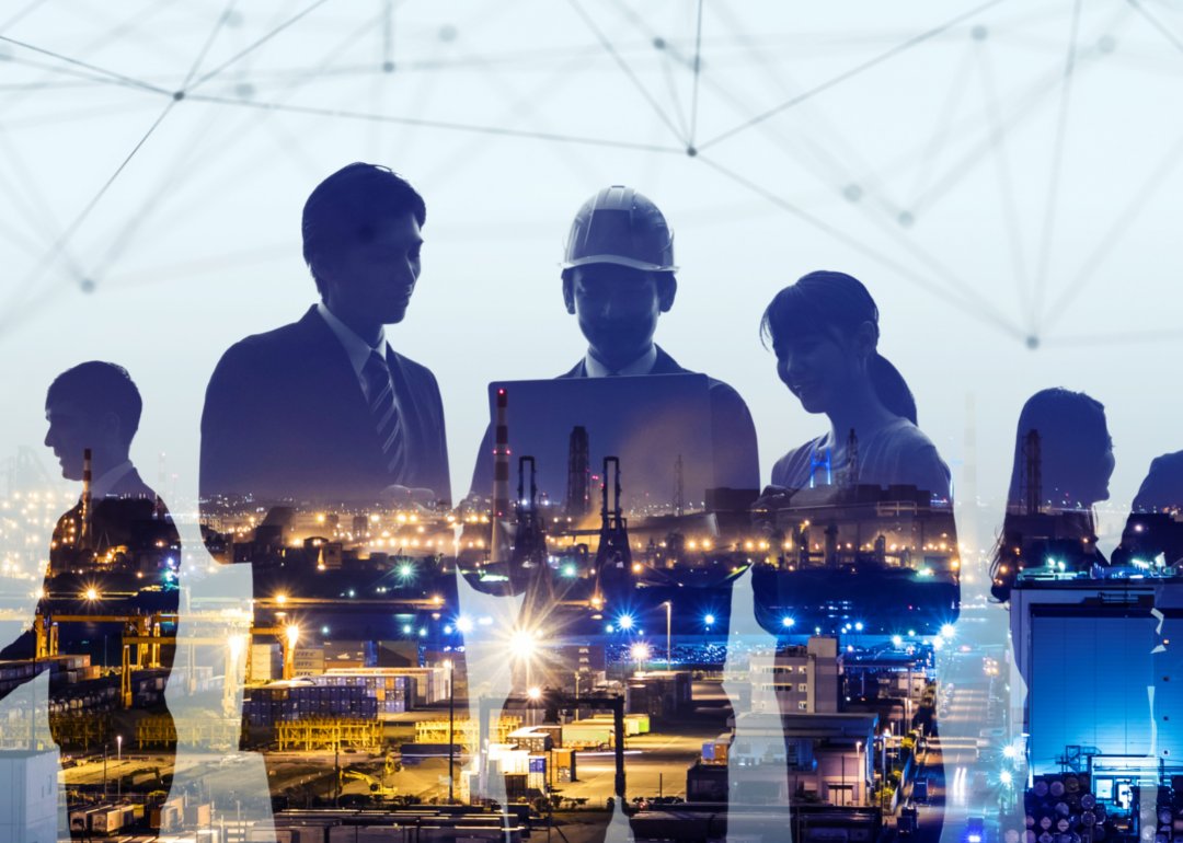 Graphic-designed image of silhouettes of people working overlayed with a photo of an industrial area.