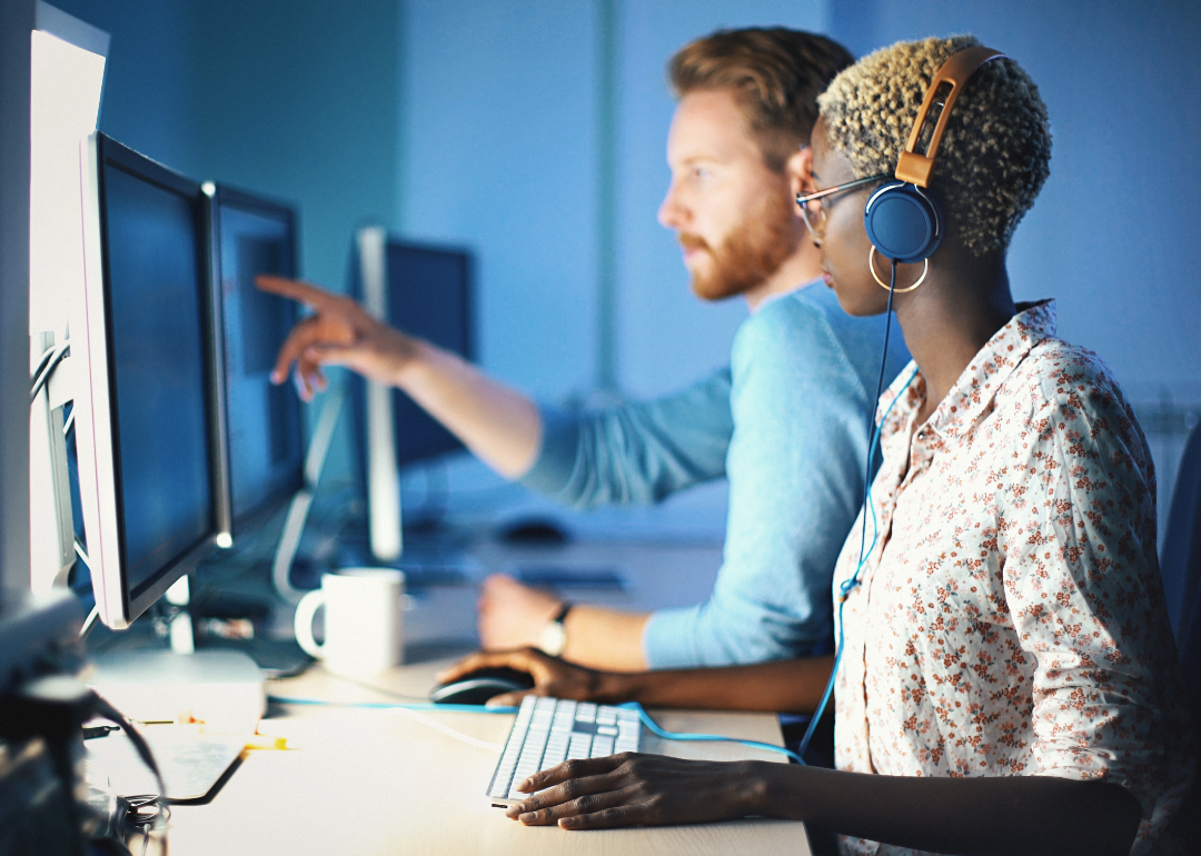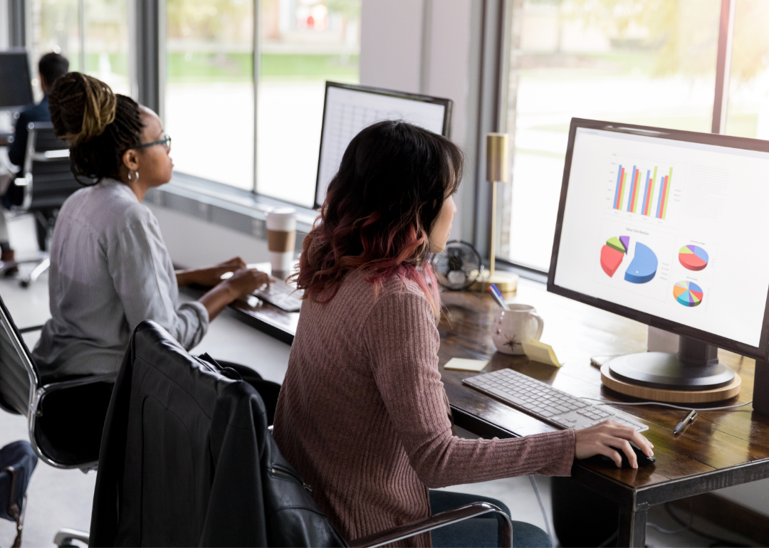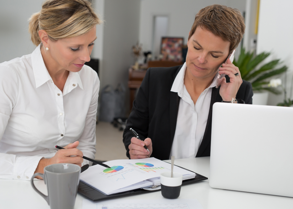 Two business people sat beside each other in front of charts on paper and a laptop.