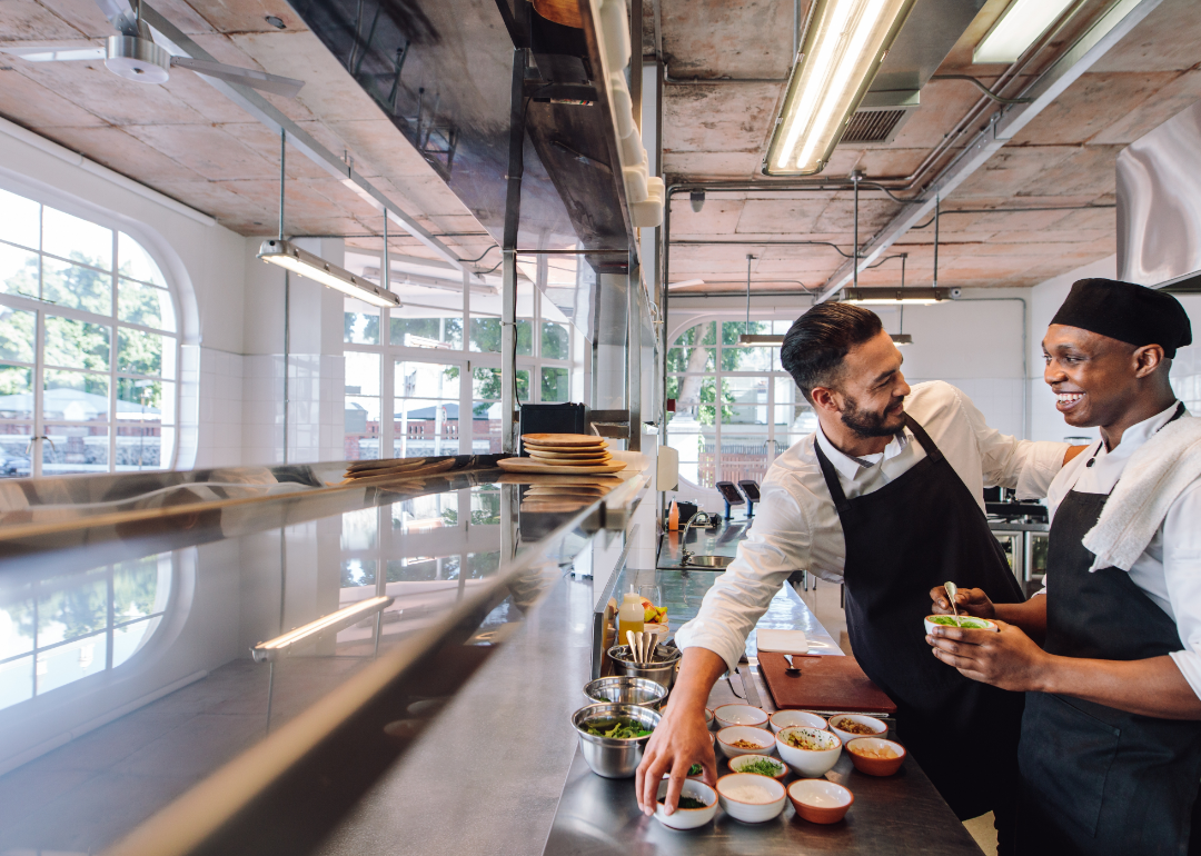 The silhouette of two workers standing on scaffolding with the sky in the background.