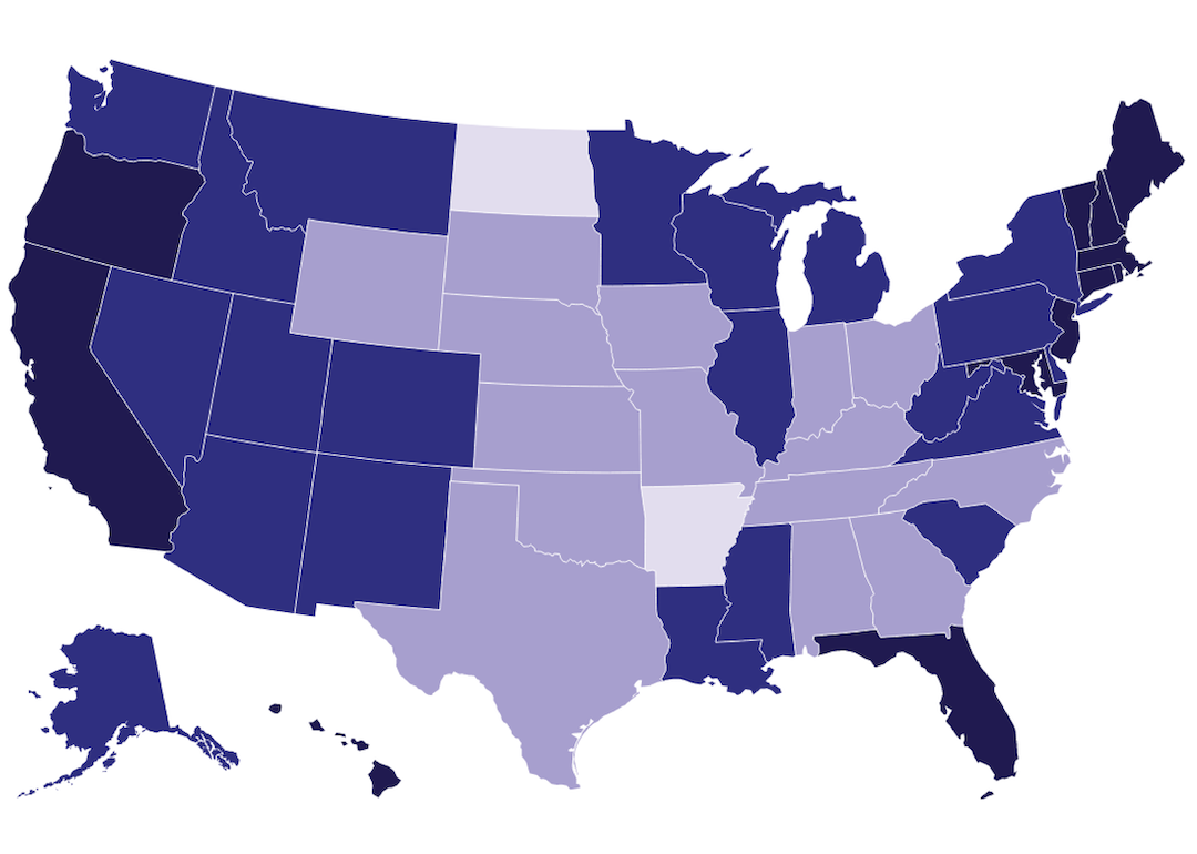 Choropleth map that shows how many jobs are required at the average renter’s wage to afford a two bedroom rent in every state.