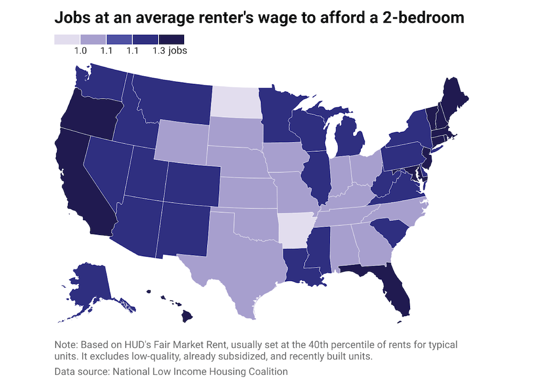 – Jobs at average renter’s wage needed to afford a 2-bedroom: 1.4