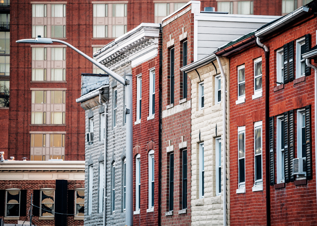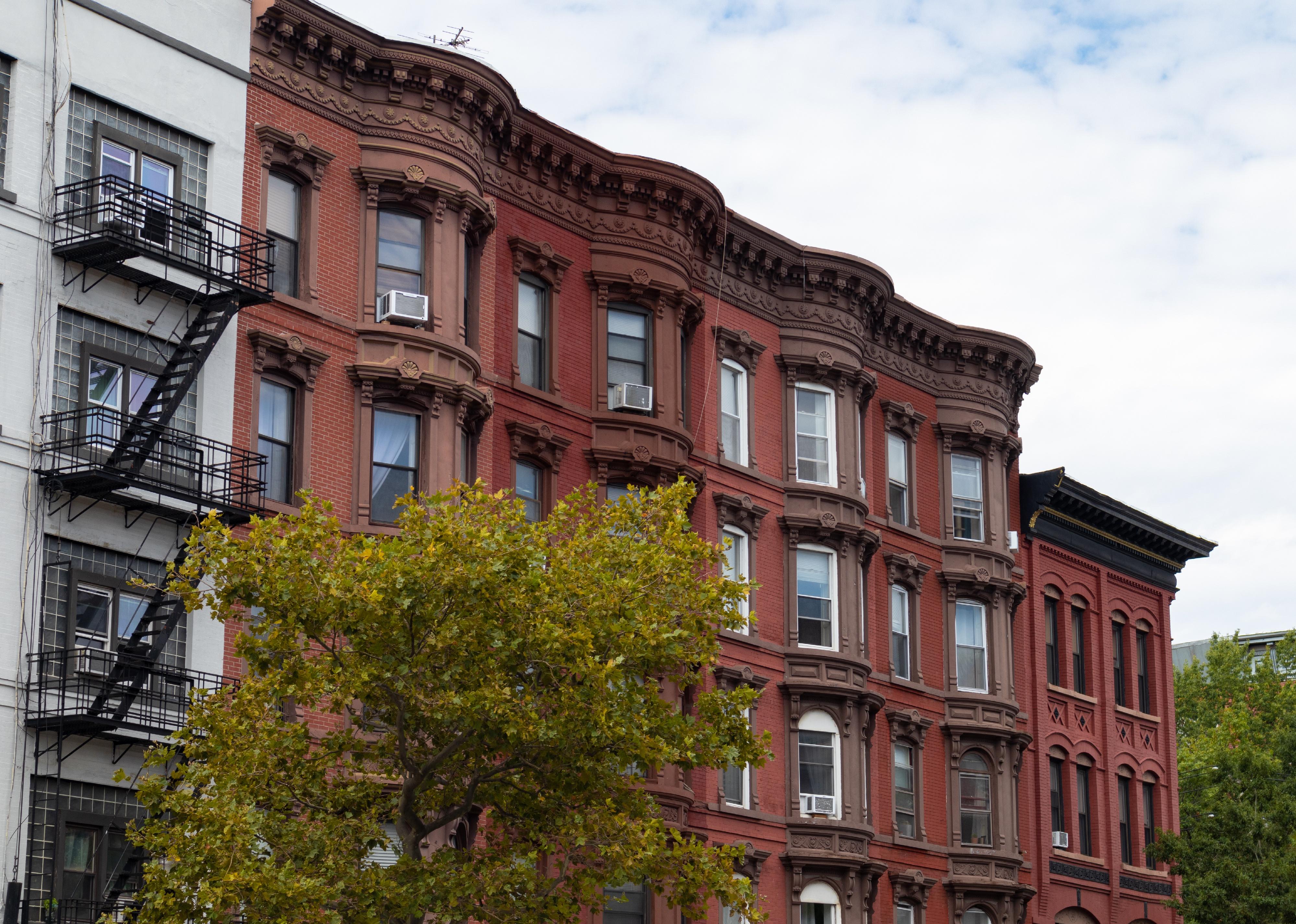Row of colorful old brownstone buildings in Hoboken, New Jersey