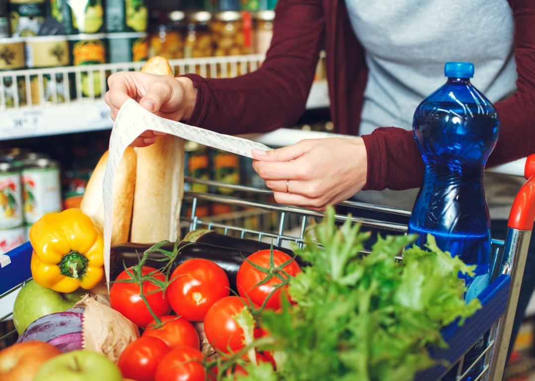 Person shopping at the grocery store with cart.