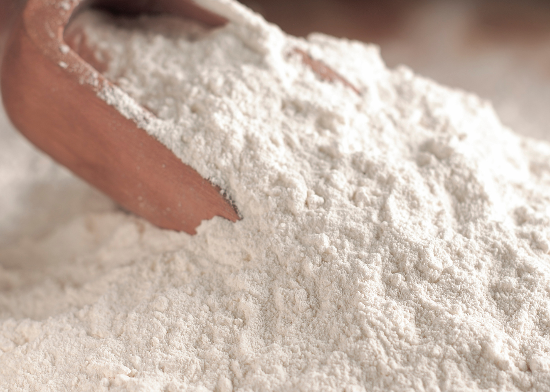 A wooden scoop in white flour.