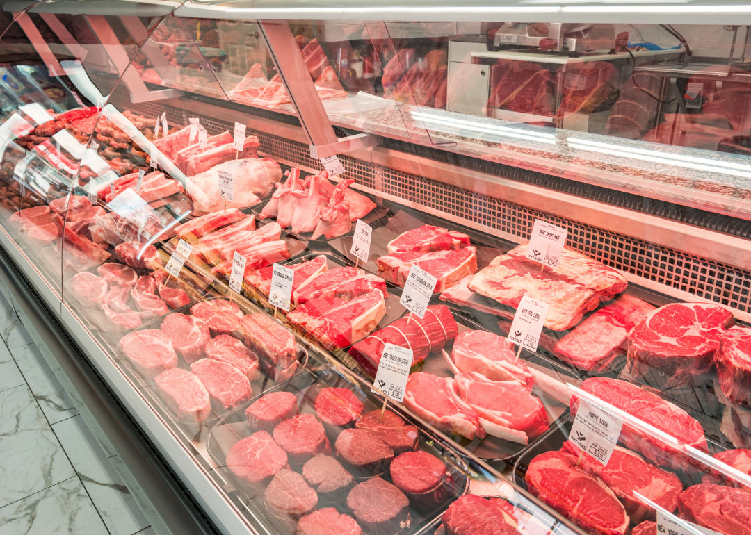 An array of steak meat in a display case at a supermarket.