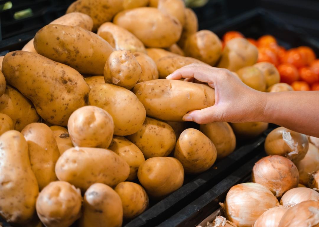 Person picking up potato in supermarket.
