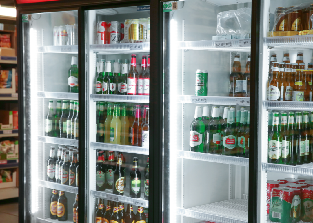 A variety of beers in a refrigerator in a supermarket