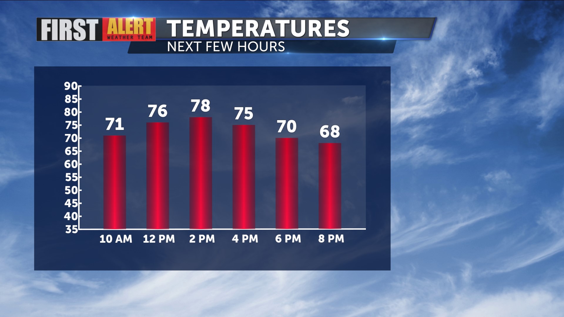 This afternoon, anticipate highs warming to the upper seventies with light breezes and little to no cloudcover.